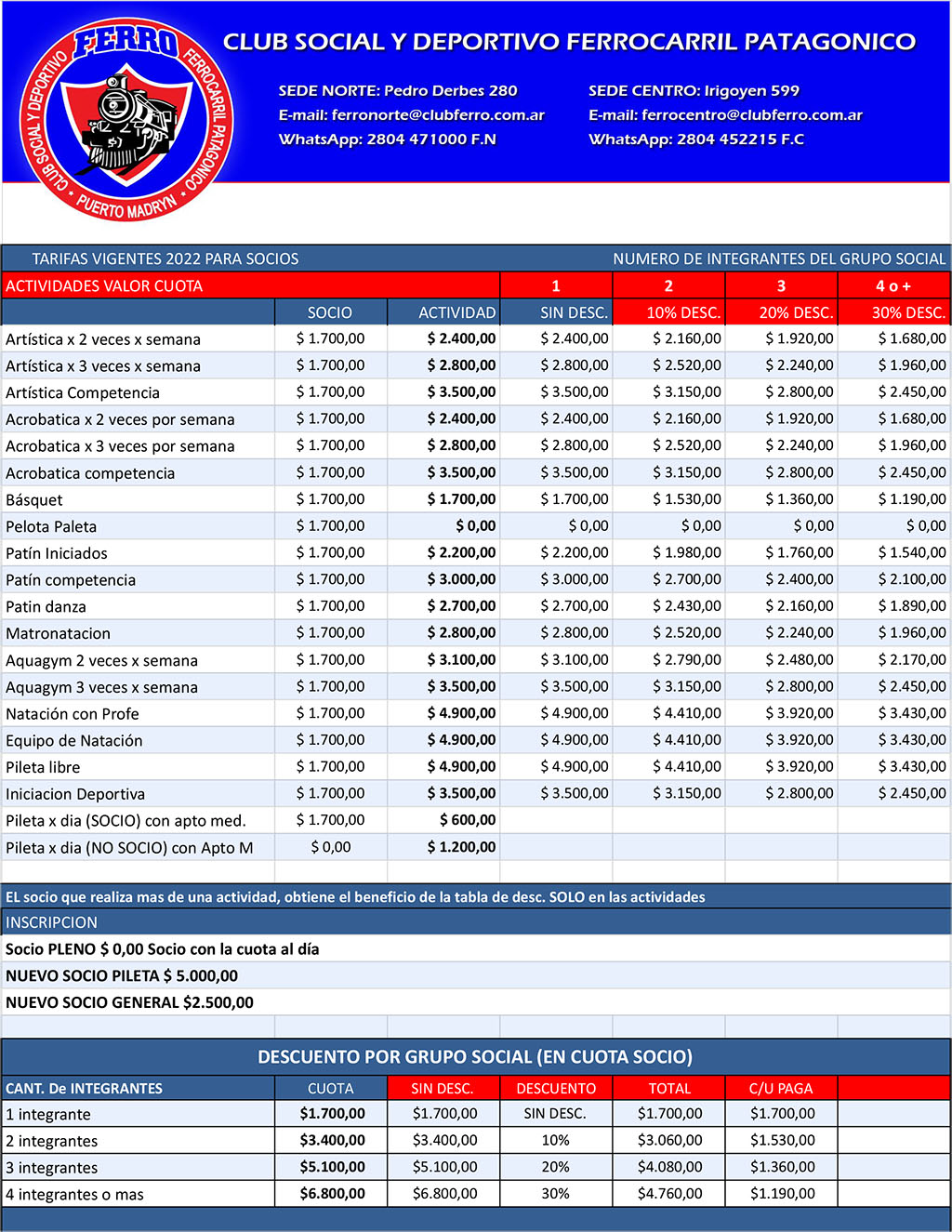 SEDE NORTE: Pedro Derbes 280 - Tel.Wsp: 2804471000 - Email:ferronorte@clubferro.com.ar